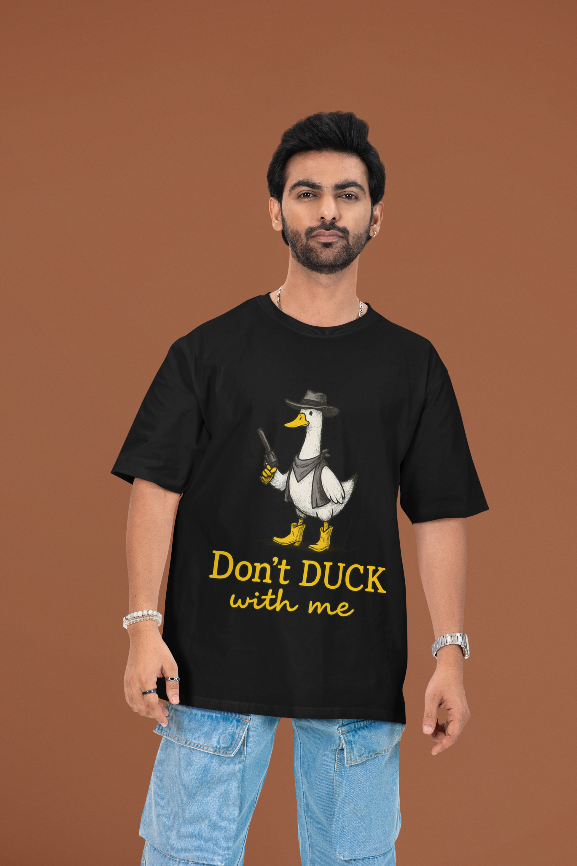 This oversized tee features a wild west duck with a serious look, a cowboy hat, and a revolver. Below him, the warning: “Don’t DUCK with me.” It’s bold, ridiculous, and everything a fearless statement piece should be.