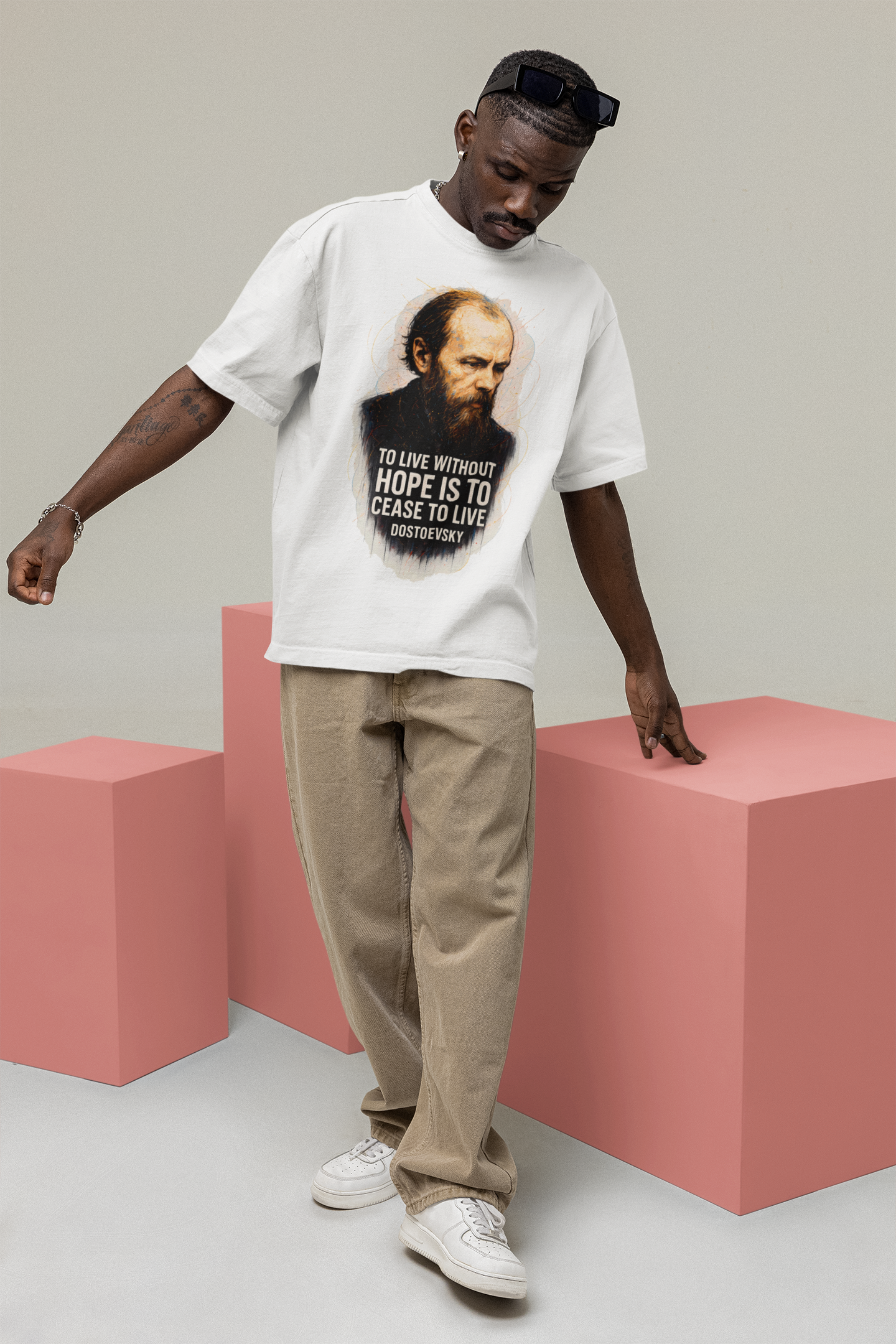 Bring deep existential truth to your wardrobe with this stunning Dostoevsky Hope Quote T-Shirt. Featuring a beautifully textured, painterly portrait of Fyodor Dostoevsky, this design radiates emotion and intensity—anchored by the powerful quote: