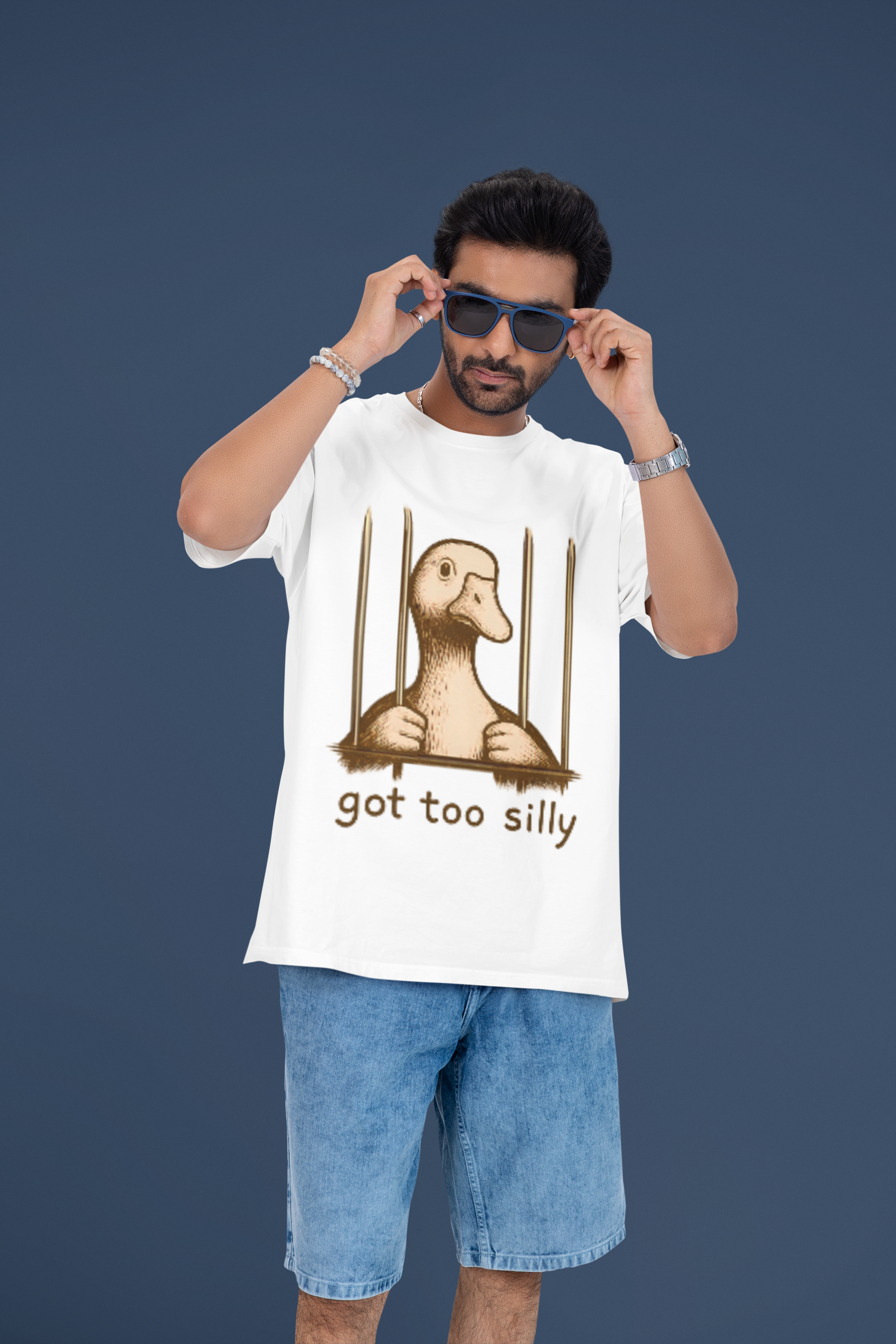 This hilarious oversized T-shirt features a cartoon duck peeking out from behind prison bars with the caption “got too silly” — because sometimes your silliness just can't be contained. Perfect for class clowns, mischief-makers, and those who know how to cross the line... in style.