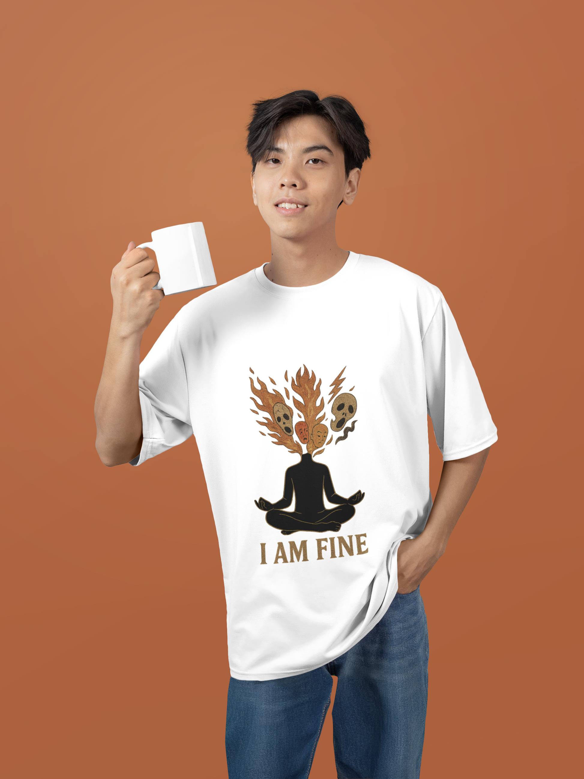 This oversized Terry cotton tee captures the surreal tension of appearing βokayβ while absolutely not being okay. Featuring a figure in meditation with flames and masks of emotion erupting from their head, and the painfully ironic caption:
